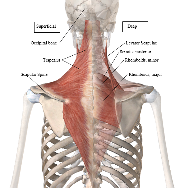 Origin: Occipital bone, spinous process of T1-12, Insertion: Lateral clavicle, acromion, and scapular spine of scapula Action: Rotation, retraction, elevation, depression of scapula; extends neck; stabilizes shoulder Innervation: Accessory nerve (Cranial Nerve 11)