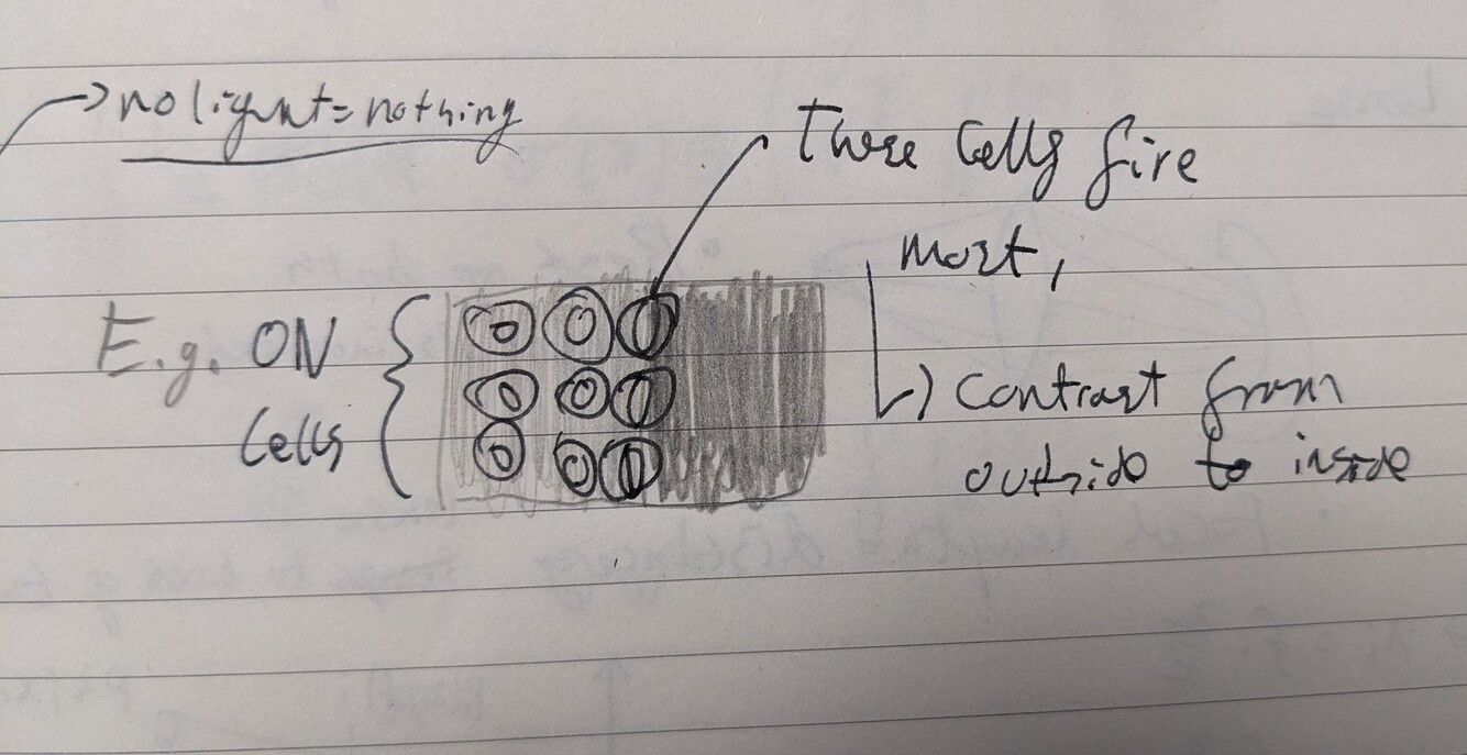 If say left side is brighter than the right side. The centre of the cell will be illuminated as will the outside on the left, however the outside on the right may not be activated causing the outside of the cell to be less illuminated overall than the centre. This would cause the on cell to fire rapidly