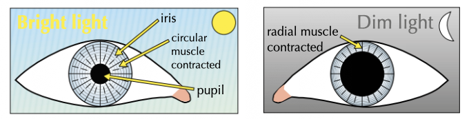 How does eye change in dim light and bright light?