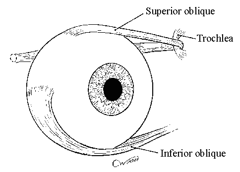 Originates from body of sphenoid bone. Tendon passes through trochlea, changes direction to go laterally, attaches to posterior surface of eye