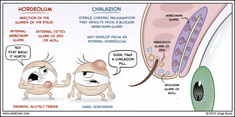 A chalazion - is a firm, nontender nodular non-painful inflammation on the inside of the eyelid, usually in the Meibomian gland.