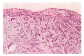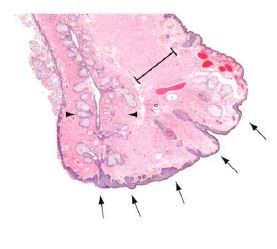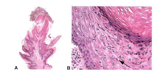 Verruca vulgaris and a papillary growth pattern with fingerlike projections.