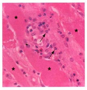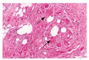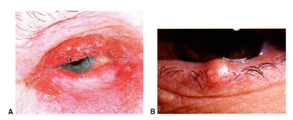 Chalazion and granulomatous inflammation consisting of epithelioid histiocytes and multinucleated giant cells.