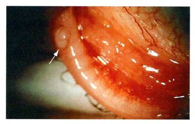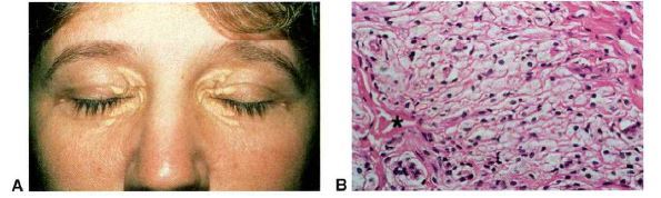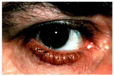 Cutaneous amyloid with multiple myeloma and waxy elevation and purpura of the lower eyelid.