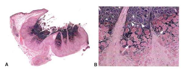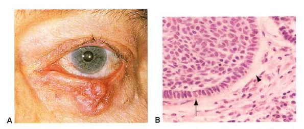 Nodular type basal cell carcinoma. And palisading of the cells and artifactitious separation between the nests of tumor cells.