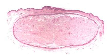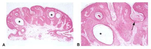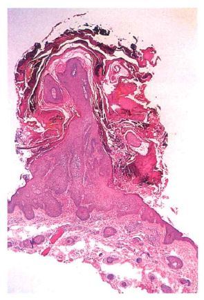 Seborrheic keratosis and keratin-filled cysts and pseudohorn cysts.