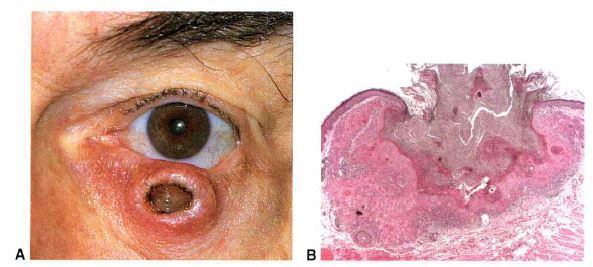 Keratoacanthoma and central keratin crater and downward growth pattern.