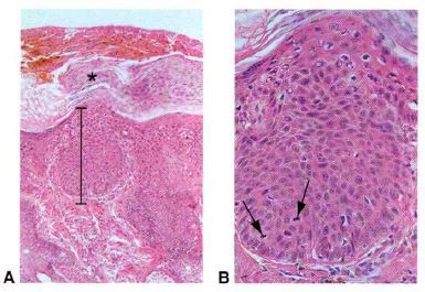 Actinic keratosis and epidermal acanthosis, disorganization within the epidermis, parakeratosis, and inflammation within the dermis.