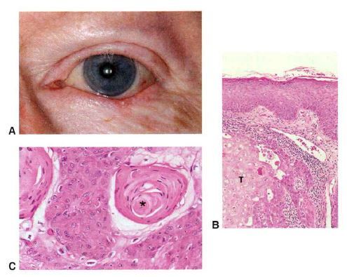Squamous cell carcinoma. And a focal loss of lashes, scaly appearance of the lower eyelid, and the presence of a keratin pearl.
