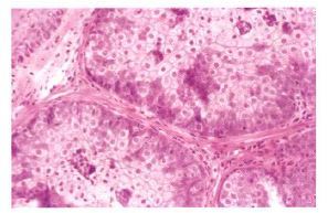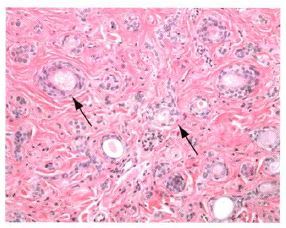 Sebaceous hyperplasia with numerous sebaceous lobules surrounds a hair follicle.