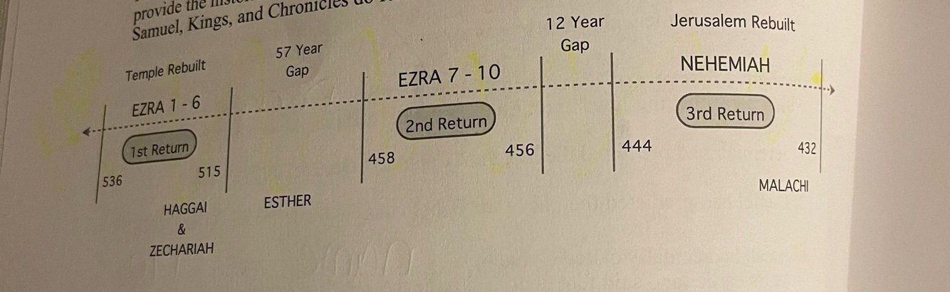The first 2 of 3 major returns of the Jews to Jerusalem from the Babylonian Captivity, the rebuilding of the Jewish Temple, and the perils of the early settlers.