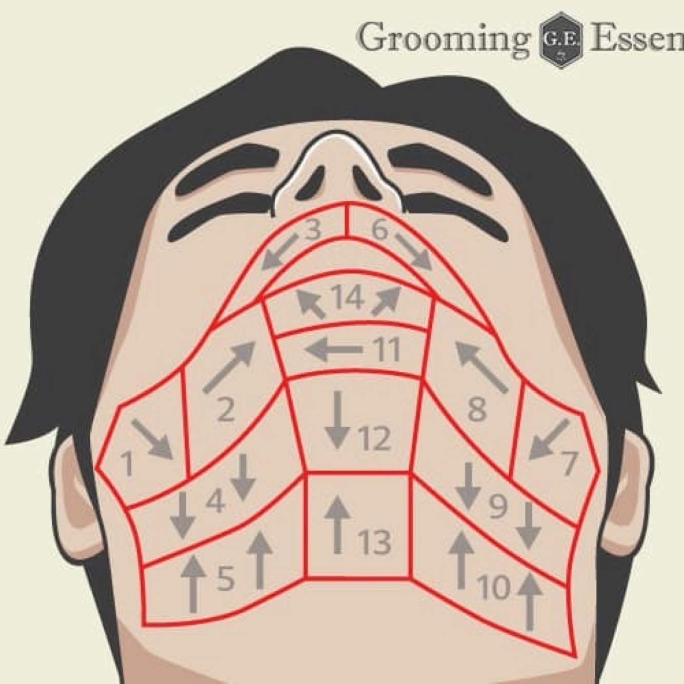 The razor position and strokes used in 6 of 14 shaving areas; number 1, 3, 4, 8, 11 and 12.