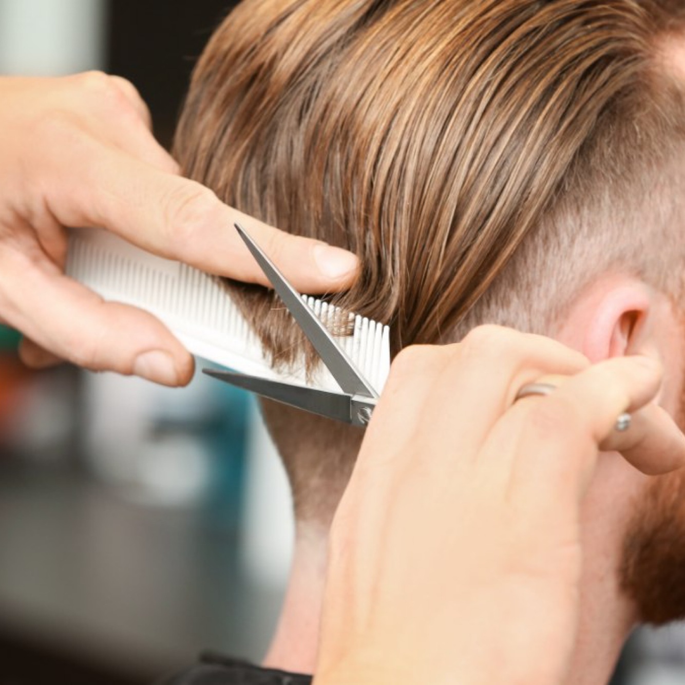 Cutting with shears without the use of fingers or a comb to control the hair.
