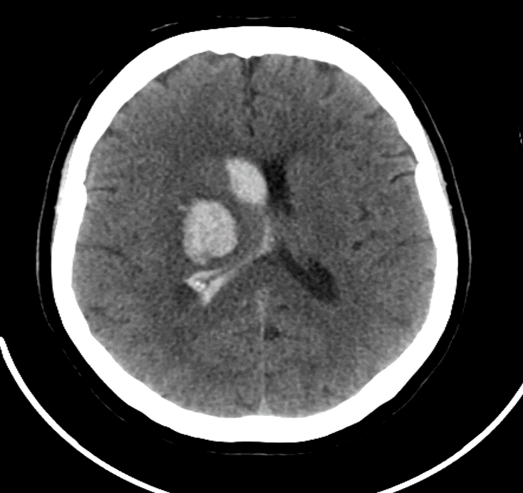 CT is very sensitive for blood – blood shows up as a white on CT – can see this man has a haemorrhage