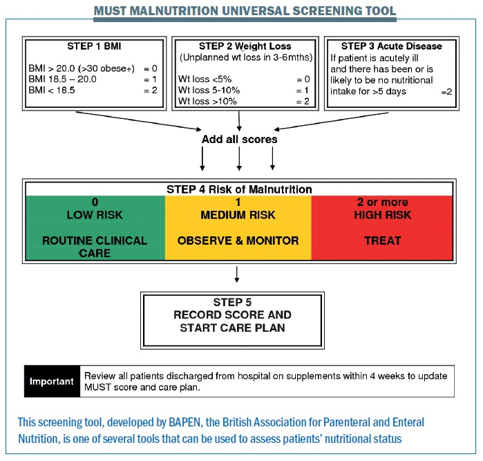 They should be screened weekly for malnutrition using MUST (Malntrition universal screeing tool) thereafter