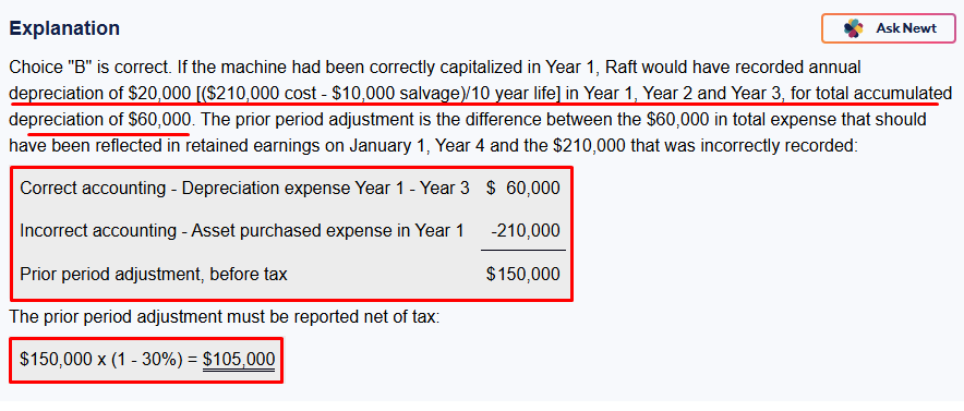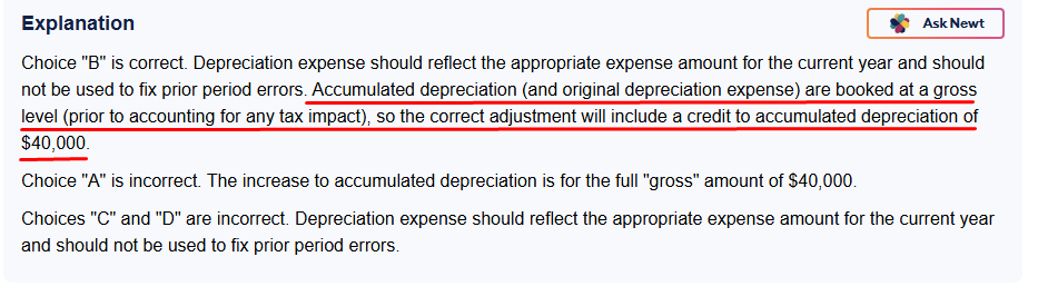 Choice “B” is correct. This error should be corrected by restating the opening balance of retained earnings by $10,000 for Year 2, if only Year 2 financial statements are being presented. If Year 1 financial statements are being presented, then they should be corrected to reflect the proper Year 1 depreciation expense. In either case, this would have NO effect on the Year 2 depreciation expense, which is $10,000.