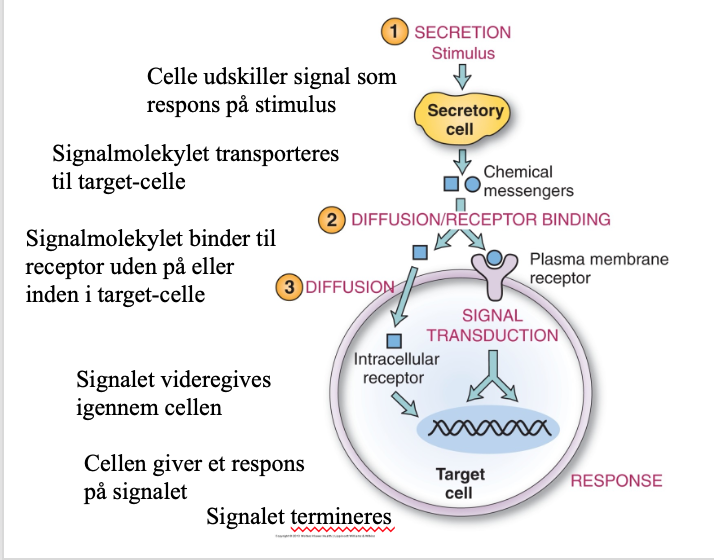 Endokrin: Signalmolekylet udskilles til blodet. Store afstande, mange væv kan være target