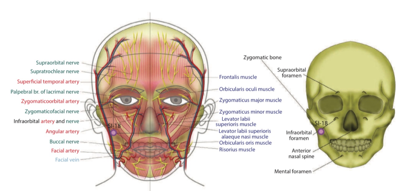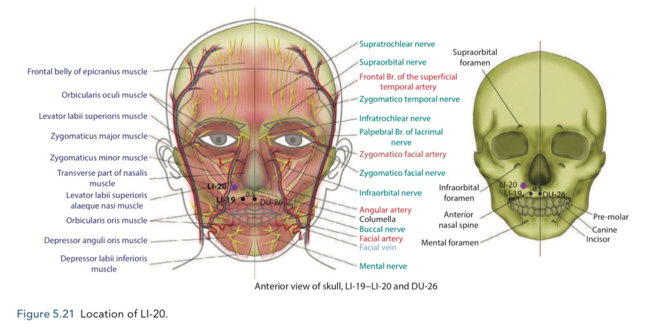 Observe the person’s nostril and the surrounding nasal wing, or alum. This point is found on a level with the middle of the lateral side of the nasal