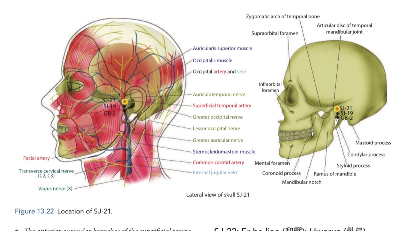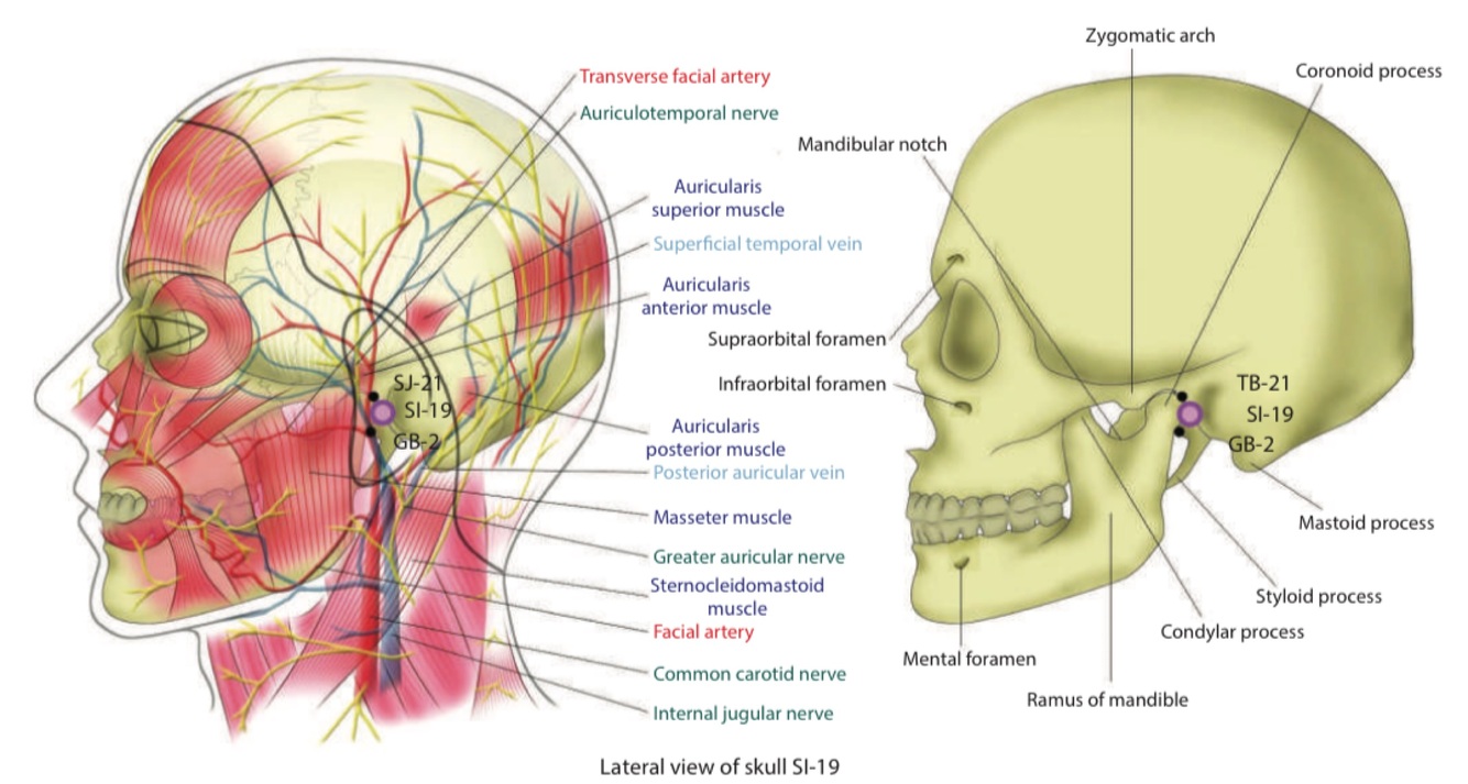 Have the patient sit with their mouth slightly open. Locate this point on their face, in the depression between the supratragic notch and the condyloid process of the man- dible. This point is directly above SI-19 (ting gong).