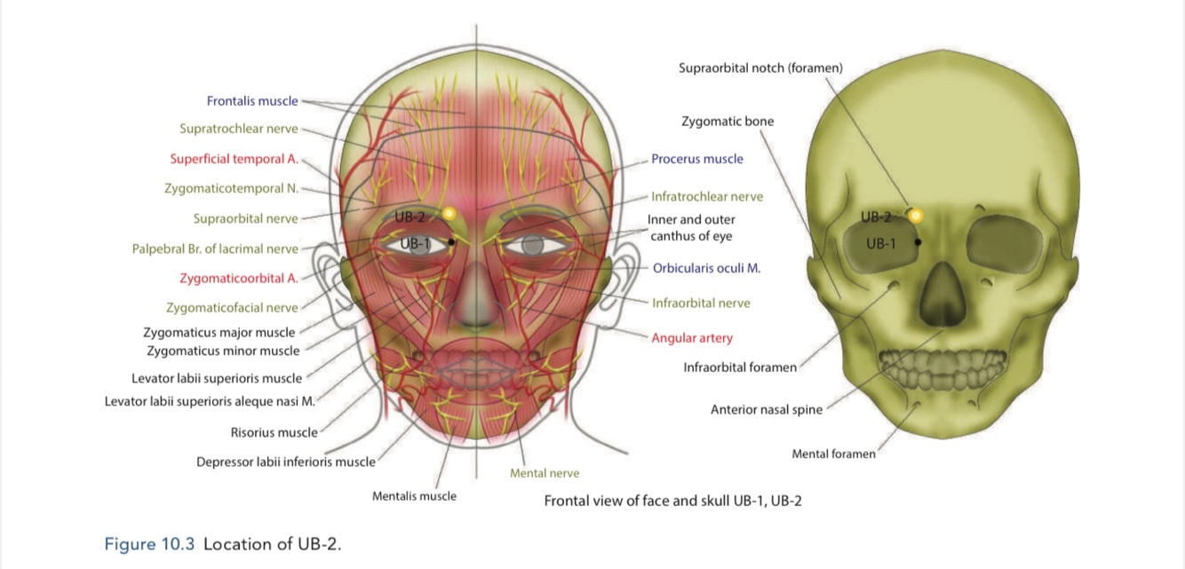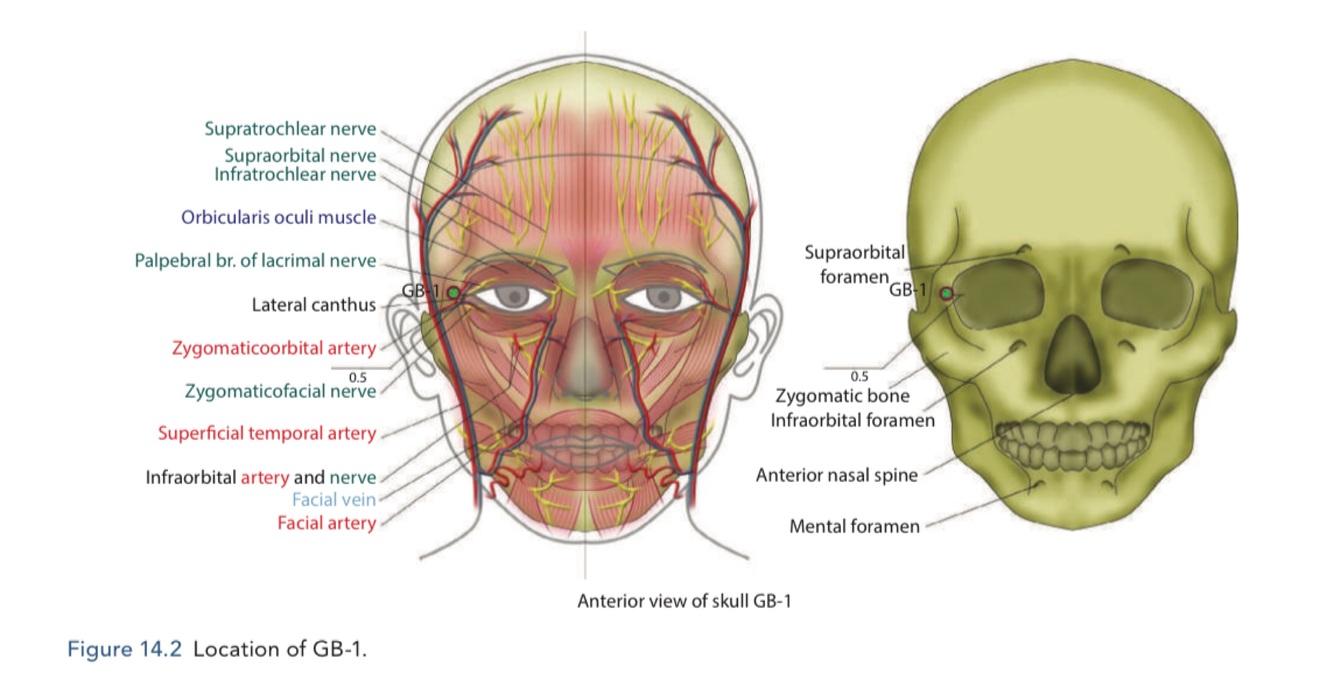 This point Is found close to the medial end of the eyebrow. Feel the ridge of bone above the eye (the supra-orbital ridge) in the area a little lateral to the medial end of the eyebrow. Here you will find a notch in the bone. This is the supra-orbital notch. The point lies in this notch