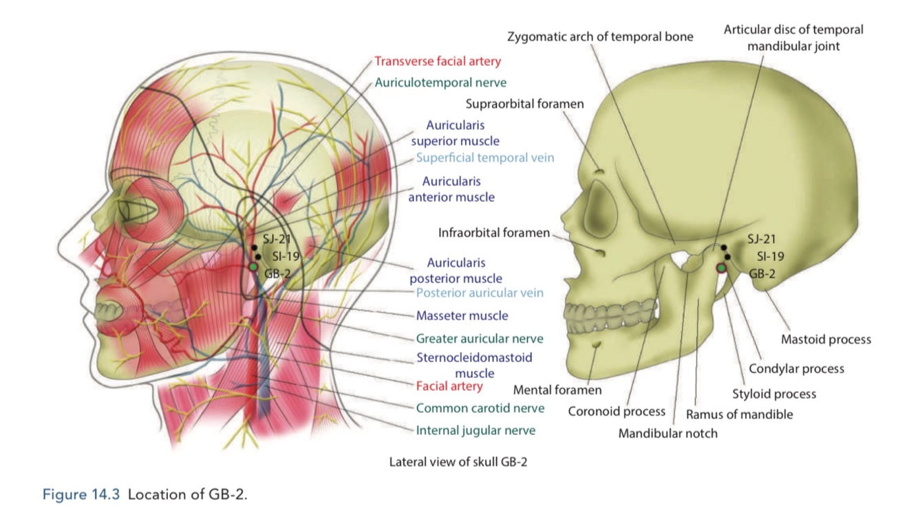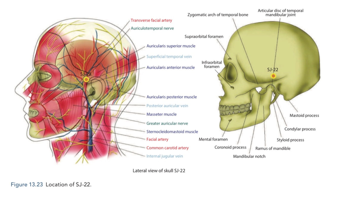Have the patient sit. Locate this point on their head, poste- rior to the temple, anterior to the auricular root. The point is located posterior to the superficial temporal artery and 1 cun anterior to the root of the auricle.