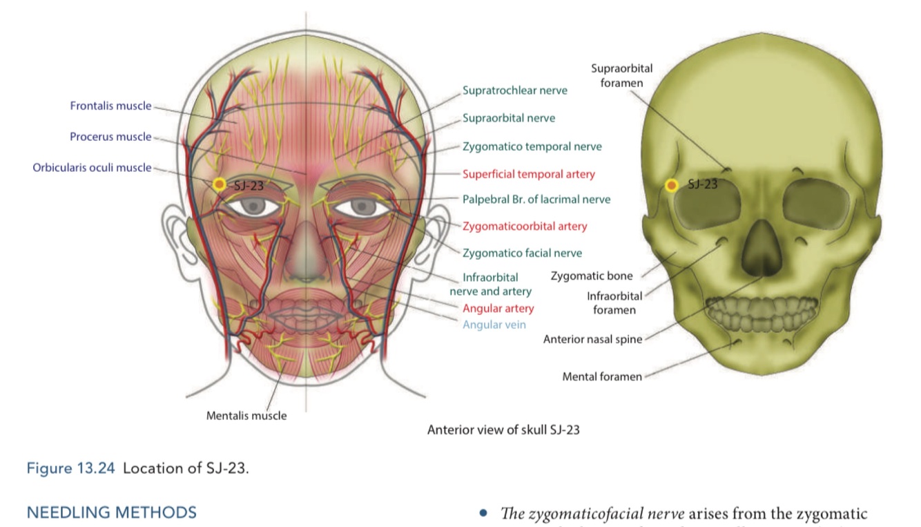 lateral side of the orbit. Roll your finger out laterally over this ridge (still on a level with the outer canthus), and the point lies where you first begin to fall into a hollow. The point is tucked in quite close to the posterior edge of the bone and lies directly inferior to TB23.
