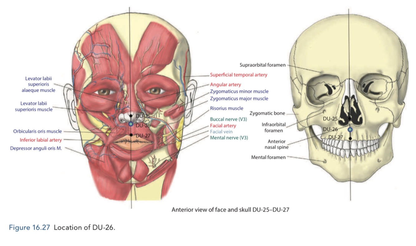 Find the philtrum, or the groove that runs from the mid-point of the nose to the centre of the top of the upper lip. The point lies a third of the way down the philtrum. If you press here, you can feel a gap between the underlying roots of the teeth.