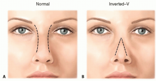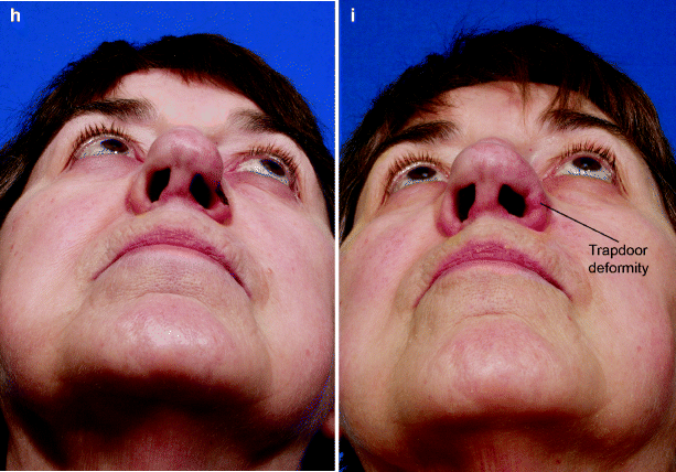 Inverted V - due to upper lat cartilages not being reattached to septum. Results in internal nasal valve narrowing/collapse.