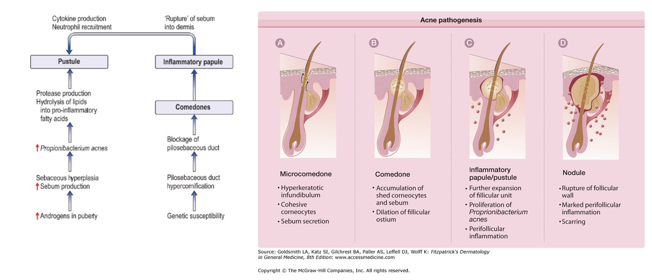 Processes involved include increased sebum production, obstruction of outflow, leakage into surrounding dermis, and excessive colonisation