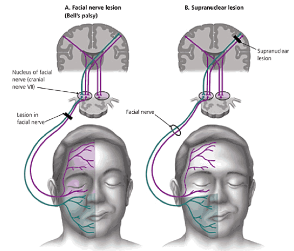 Central – påverkar pannan och ögats mimik (kan ej rynka hela pannan)