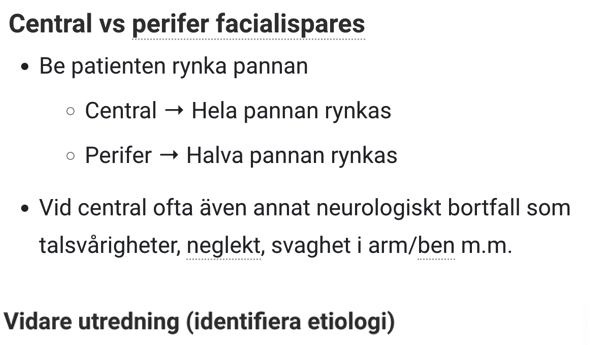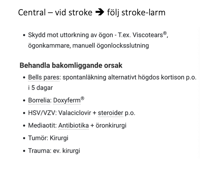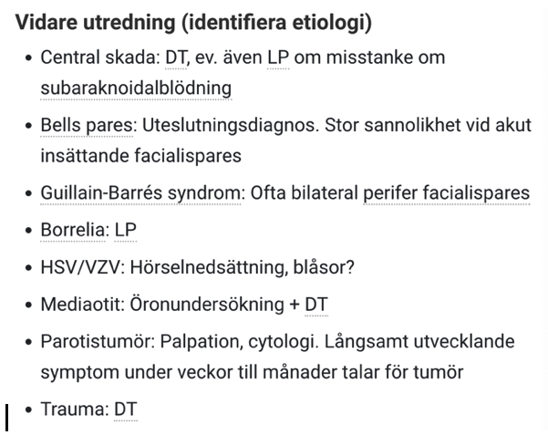 Perifer – Bells (oklar påverkan på facialis), borrelios, HSV eller VZV, tumör i ponsvikel, truma.