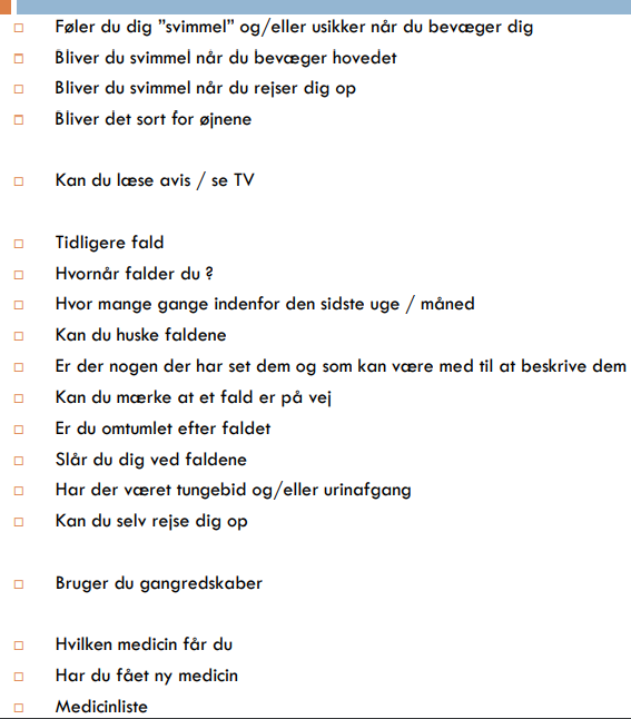 Nævn så mange årsager til fald og til svimmelhed du kan! (ikke ydre faktorer som dørkarm eller højhæle…)