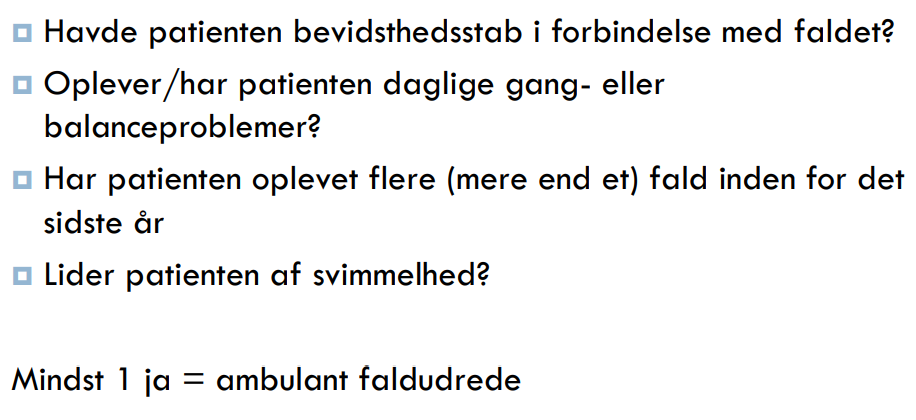 Ved akutte fald hos pt. skal man ikke gennemgå alle risikofaktorer som ved multifaktoriel ambulant udredning. Til gengæld er der en god huskeregel der hedder “9s reglen”.