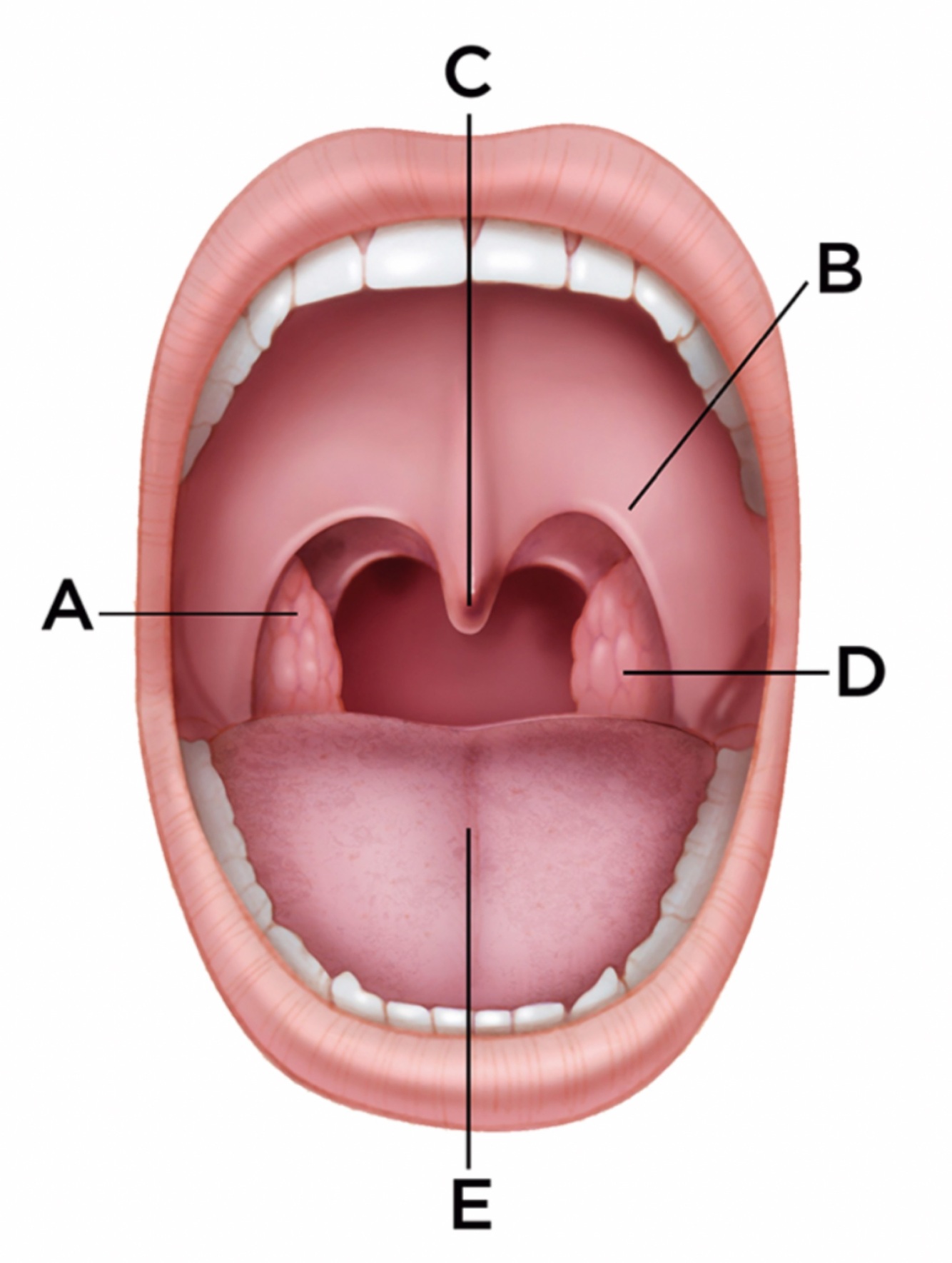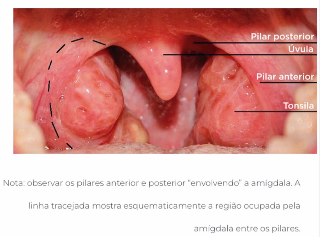 Anteriormente está o palato mole com seus dois pilares (o anterior, músculo palatoglosso, e o posterior, músculo palatofaríngeo) que representam a transição entre a cavidade oral e a orofaringe.