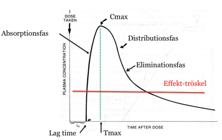 Ett LM konc i bloder över tiden. Dos 1 är när vi tar LM och Lag time är tiden de tar innan den når tarmen. Effekttröskel är den konc i blodet som behövs för att LM ska verka.