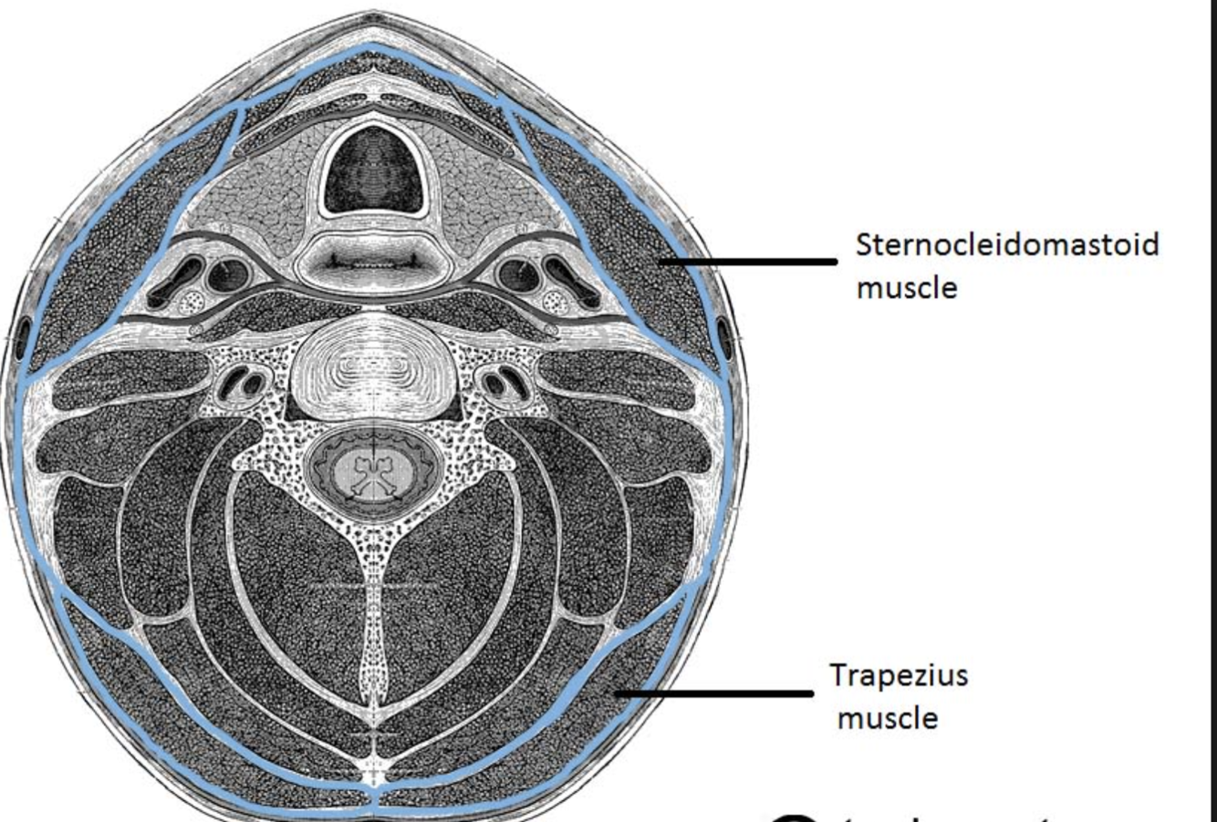 details- extends from the mastoid & mandible to the clavicle & acromion, and from the ligamentum nuchae and spinous processes to the midline; surrounds the trapezius, SCM and inferior portion of the parotid gland; continuous with remainder of the **parotid fascia.