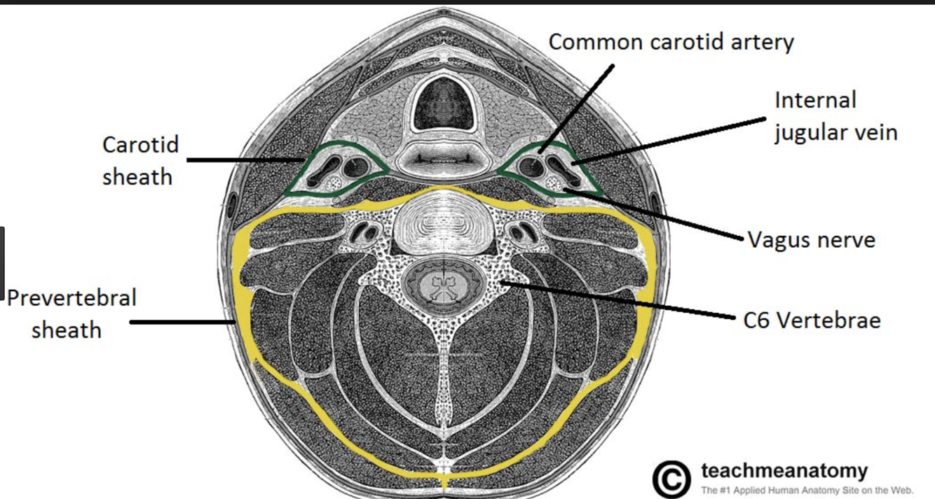details- surrounds the common & internal carotid a., internal jugular v. and the vagus n.