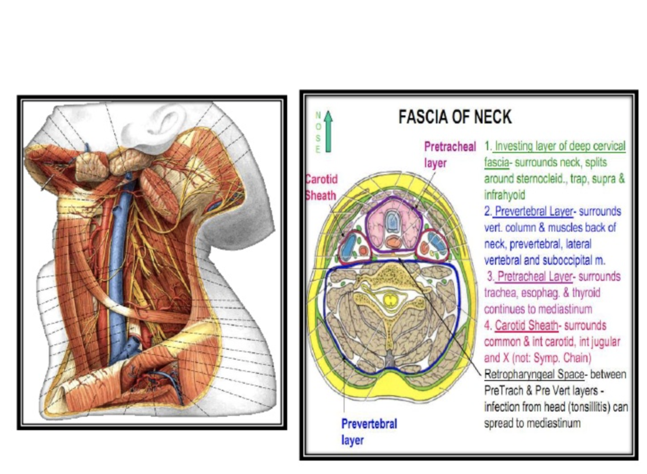 details- surrounds the infrahyoid muscles, thyroid gland, esophagus and trachea; continuous with the buccopharyngeal fascia