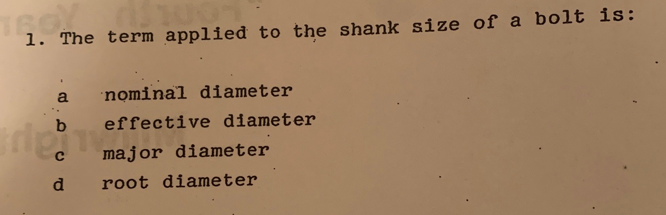 The diameter of a threaded bolt measured from the crests of the threads is known as?