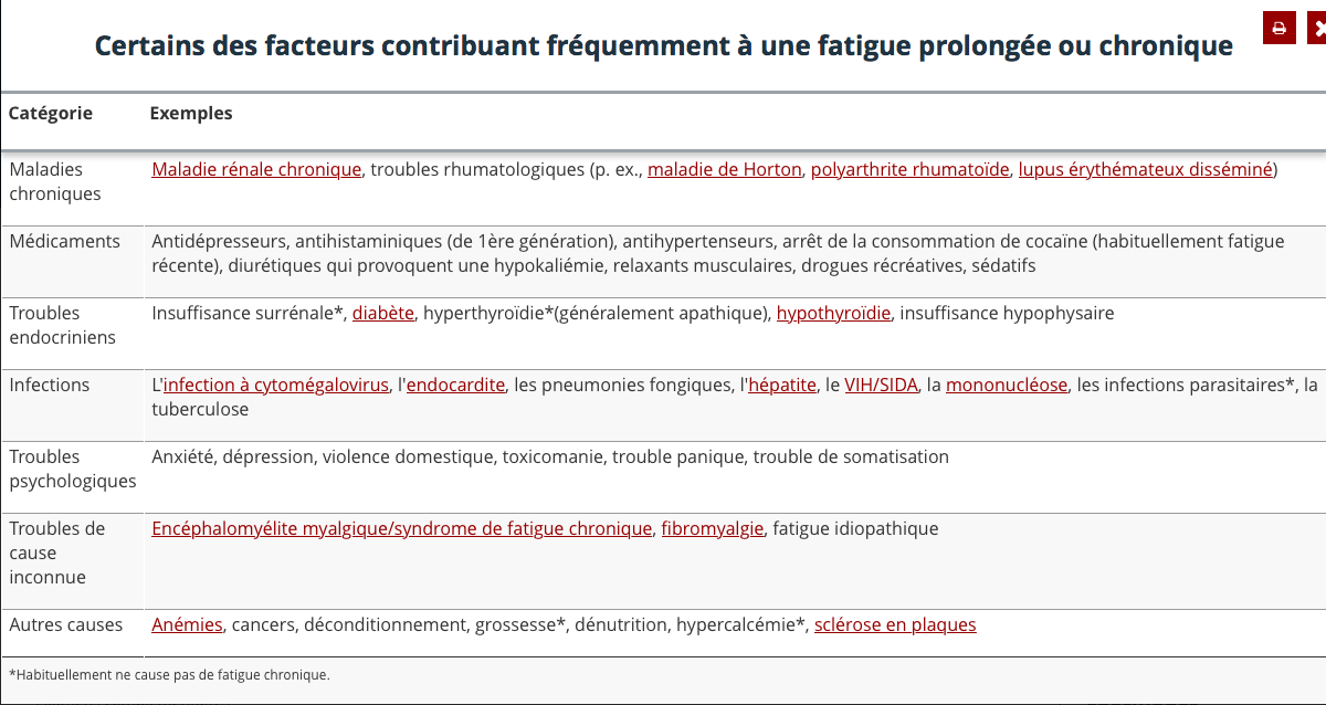 Plusieurs causes peuvent être évoquées en cas de fatigue chronique ou prolongée et d’autres signes cliniques fréquents ou spécifiques sélectionnés