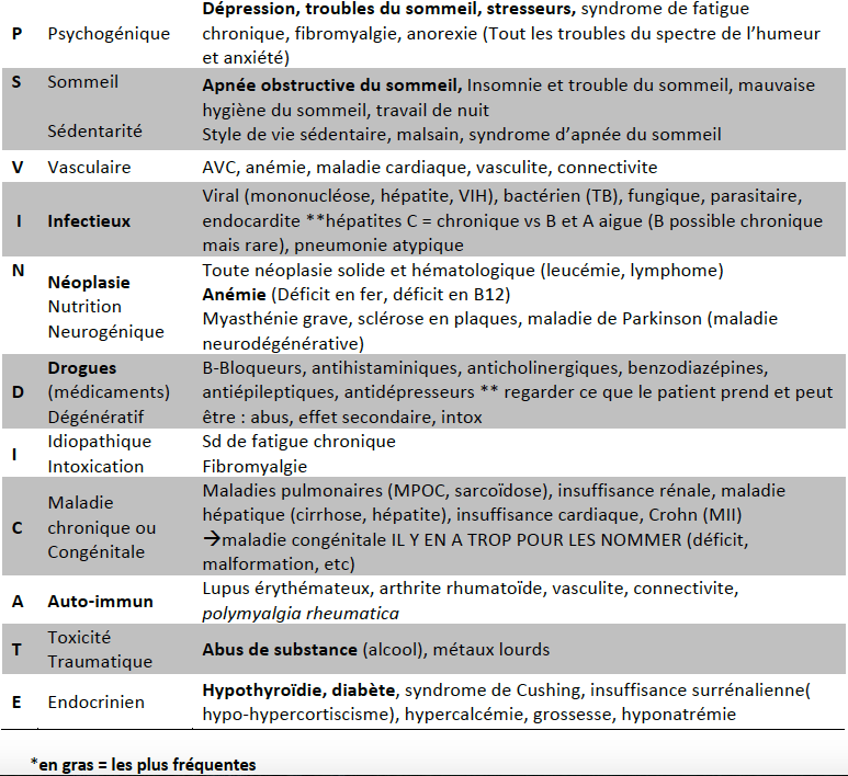 Quelles sont les principales mx qui peuvent donner de la fatigue selon le PSVINDICATE?