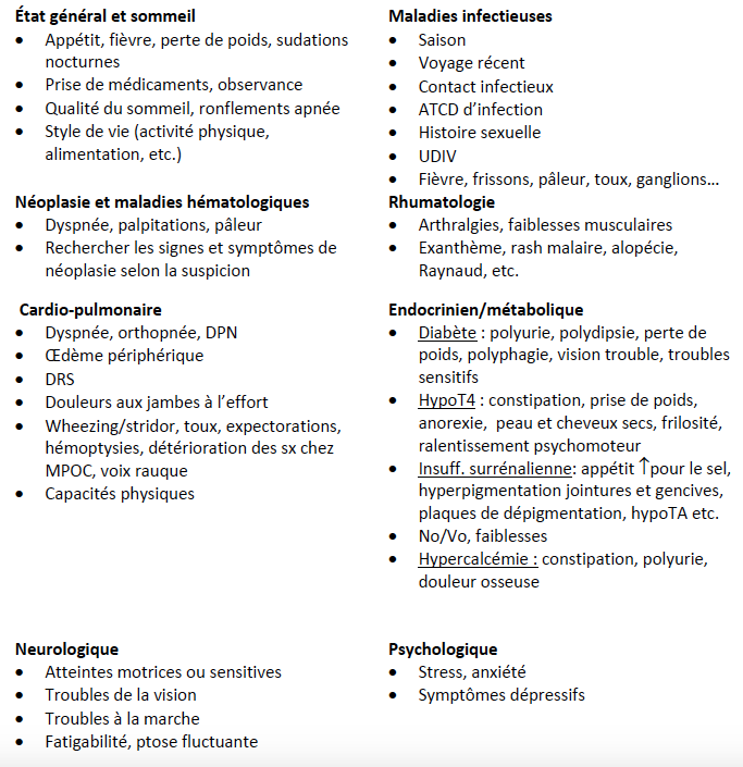Que peut-on chercher à l’anamnèse d’une consultation pour fatigue?