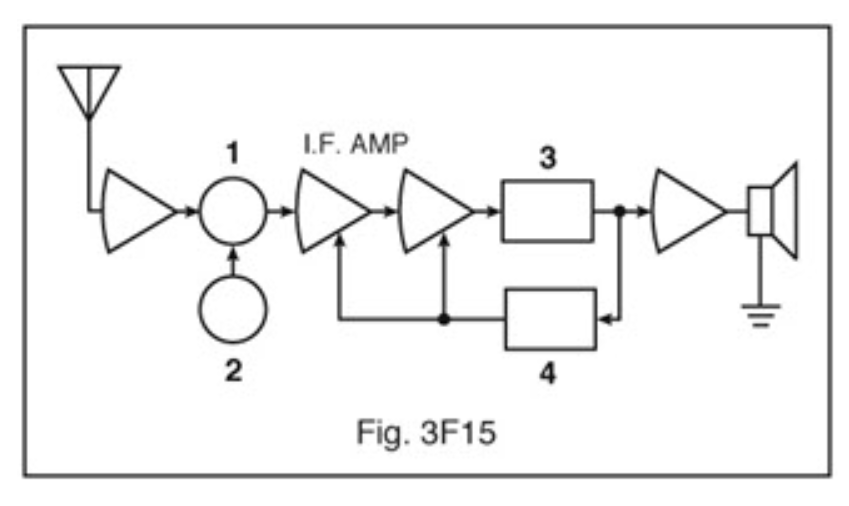 In Figure 3F15, which block diagram symbol (labeled 1 through 4) is used to represent a local oscillator?