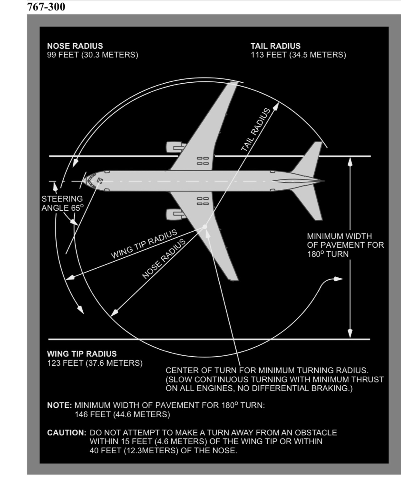 Page 45 What is the minimum width of pavement for a 180 degree turn on a 767-300 ? How about the wingspan and length ?