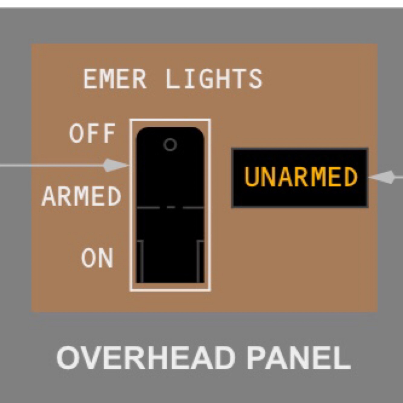 ARMED – all emergency lights illuminate if airplane electrical power fails or is turned off.