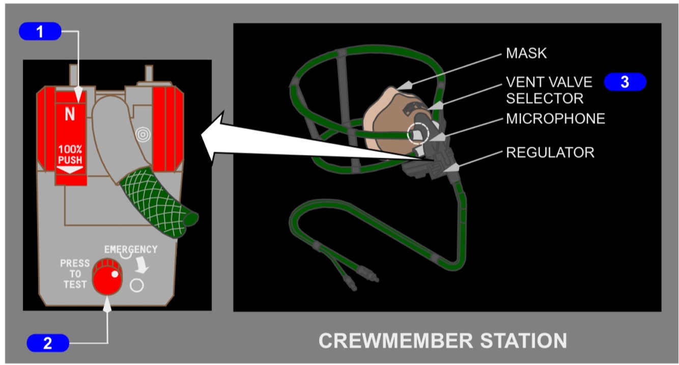 EMERGENCY position (rotate in the direction of the arrow) – supplies 100% oxygen under positive pressure at all cabin altitudes (protects against smoke and harmful vapors).