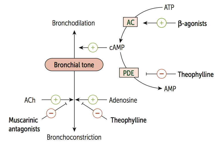 Draw a diagram and show where beta agonists, mexylthanthines, and muscarinic antagonists work
