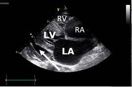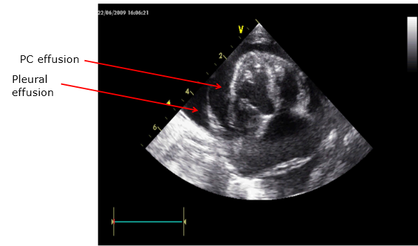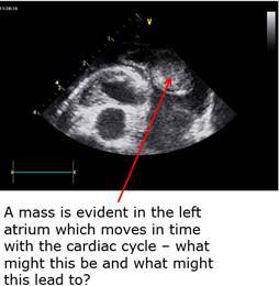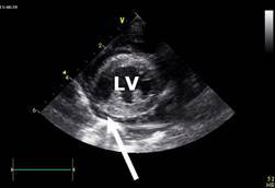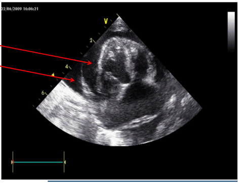 Comment on the principle features evident on the echo, in particular the relative sizes of the cardiac chambers and the thickness of the ventricular walls.