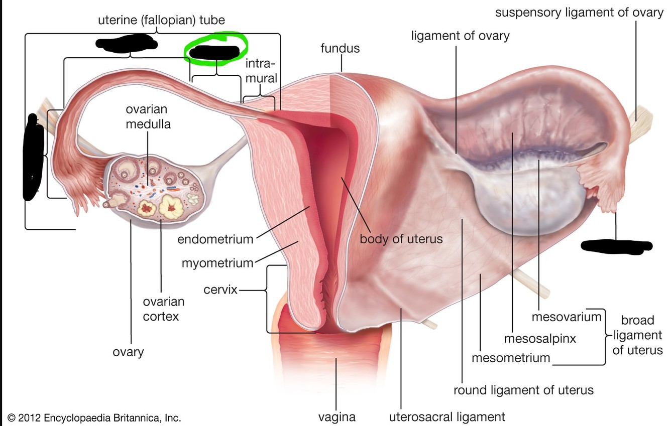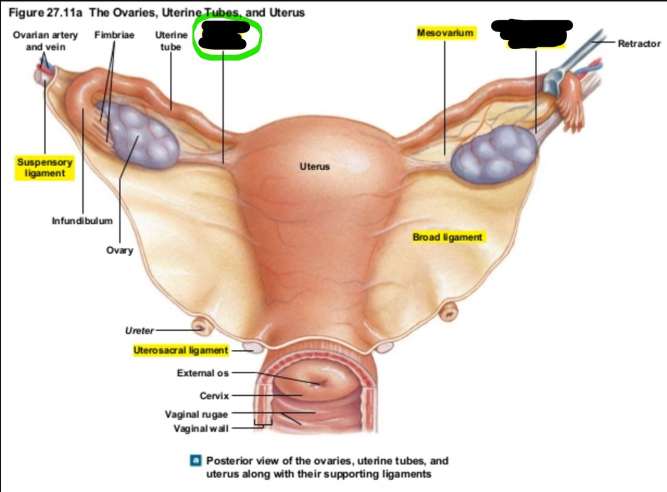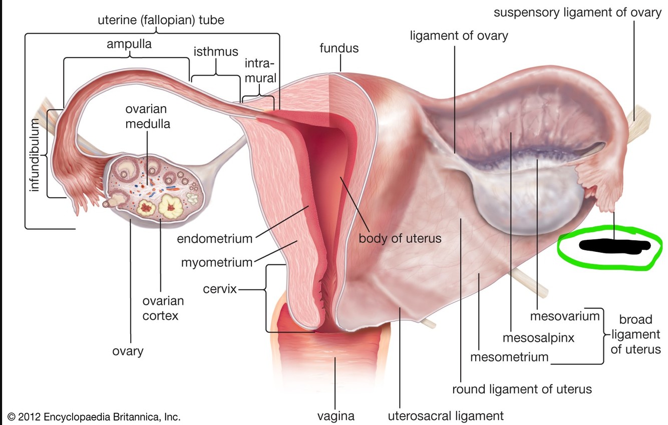 beginning of the uterine tube, just after the abdominal ostium of uterine tube, and is in relation to the free border and medial surface of the ovary.