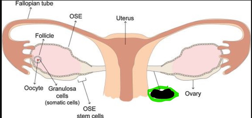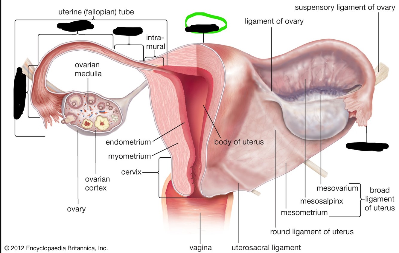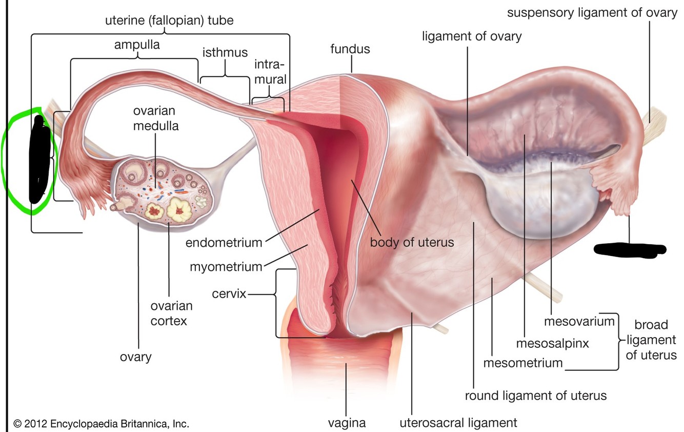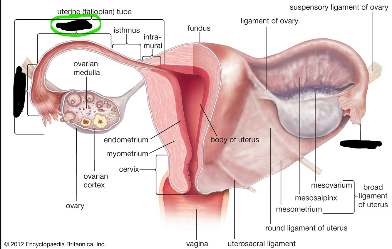 beginning of the uterine tube, just after the abdominal ostium of uterine tube, and is in relation to the free border and medial surface of the ovary.